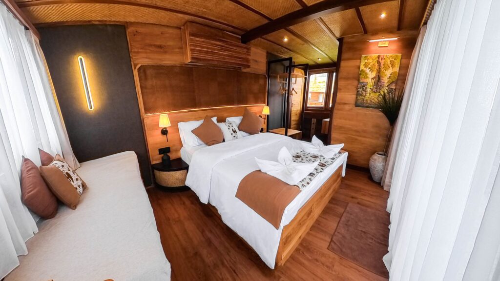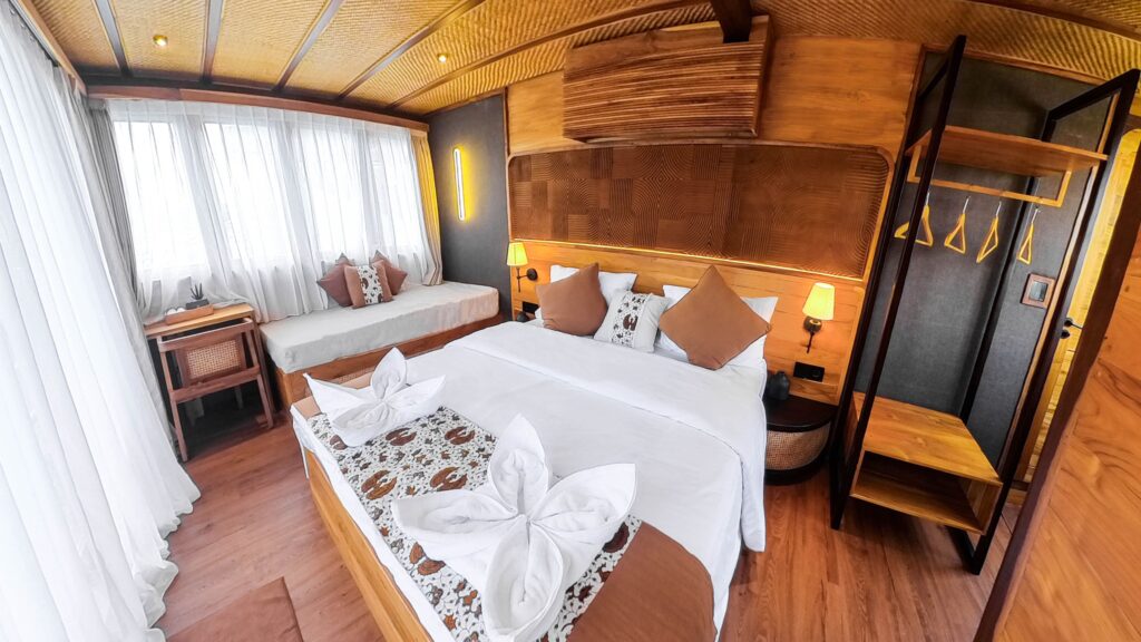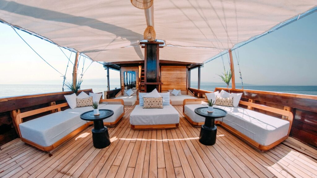 Step aboard Angelica, a premier Komodo liveaboard, and immerse yourself in a journey that blends exploration with indulgence. Her expansive decks invite sunbathing and starlit evenings, while the jacuzzi and rooftop lounge offer serene escapes after a day of adventure. Wake up to ocean views from your air-conditioned cabin, then venture out to discover Komodo’s wonders with snorkeling, kayaking, or paddleboarding. With GPS-equipped navigation, robust safety measures, and a skilled crew of eight, Angelica ensures your voyage is not only luxurious but also safe and seamless. Every detail from gourmet dining to personalized service turns life onboard into a collection of cherished moments on Indonesia’s blue horizon.